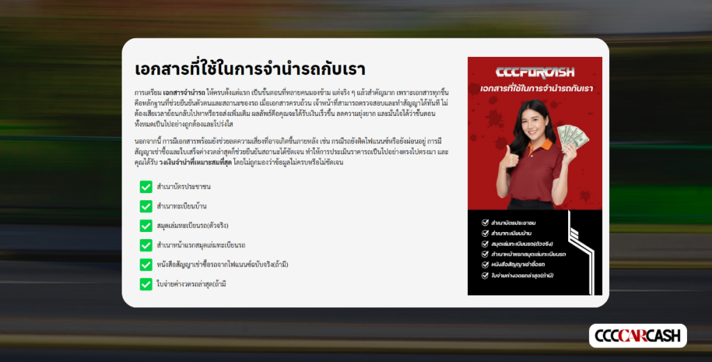 การจำนำรถเป็นกระบวนการที่รวดเร็วและตรงไปตรงมา แต่เพื่อความราบรื่นและมั่นใจว่าคุณจะได้รับวงเงินสูงสุดตามที่คาดหวัง การเตรียมความพร้อมและทำความเข้าใจขั้นตอนล่วงหน้าจึงเป็นสิ่งสำคัญ บทความนี้จะสรุปขั้นตอนการจำนำรถกับ CCCCarCash และสิ่งที่ลูกค้า ควรรู้ก่อน เข้าใช้บริการ